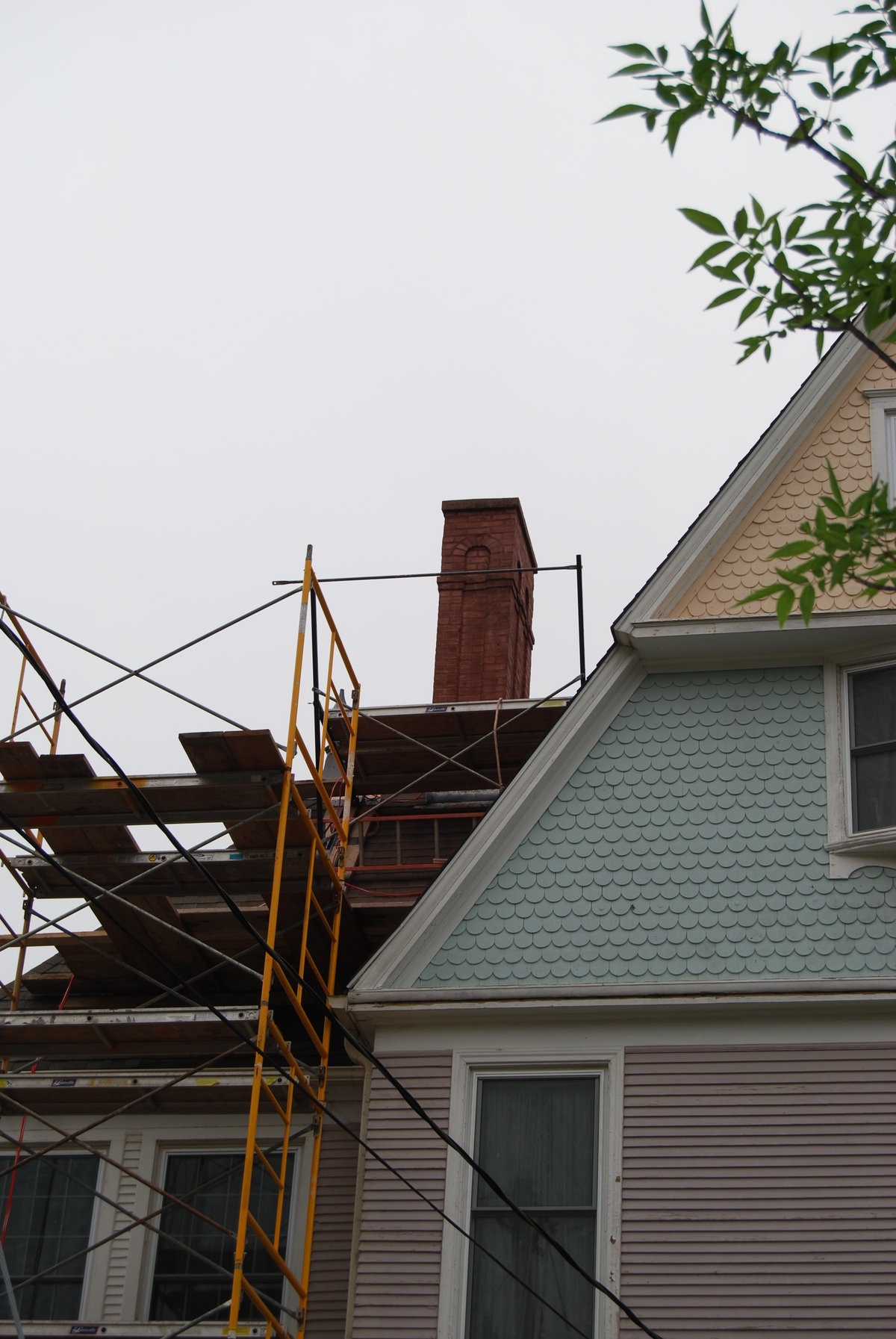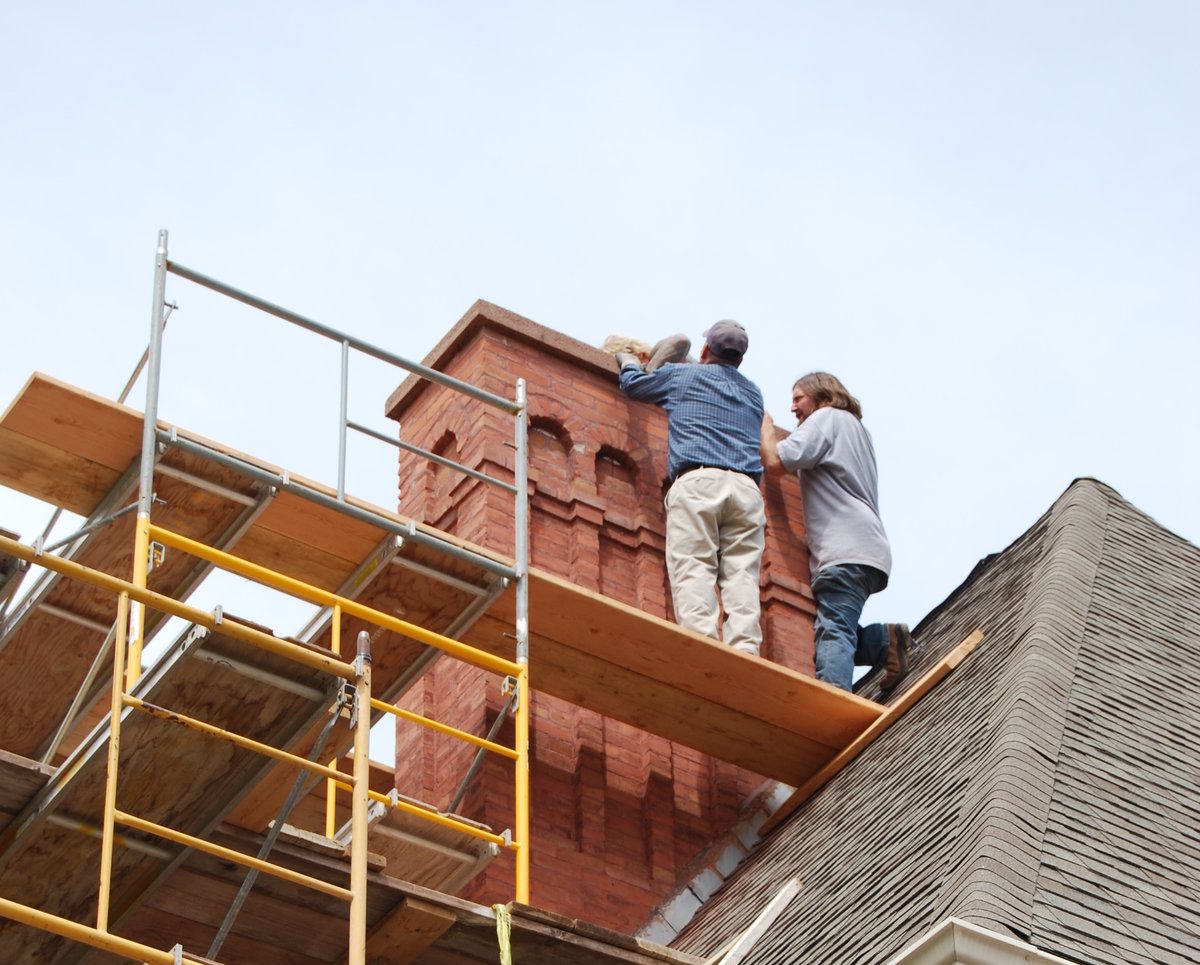 We installed scaffolding to safely access the upper sections and began by removing damaged mortar and any brick that could no longer be salvaged. Replacement brick was selected to closely match the existing material so repairs would blend naturally with the rest of the structure.