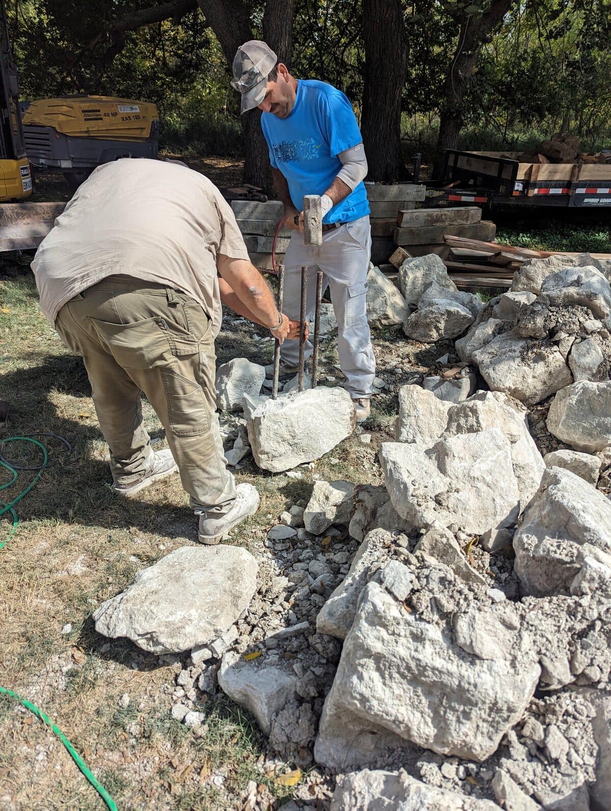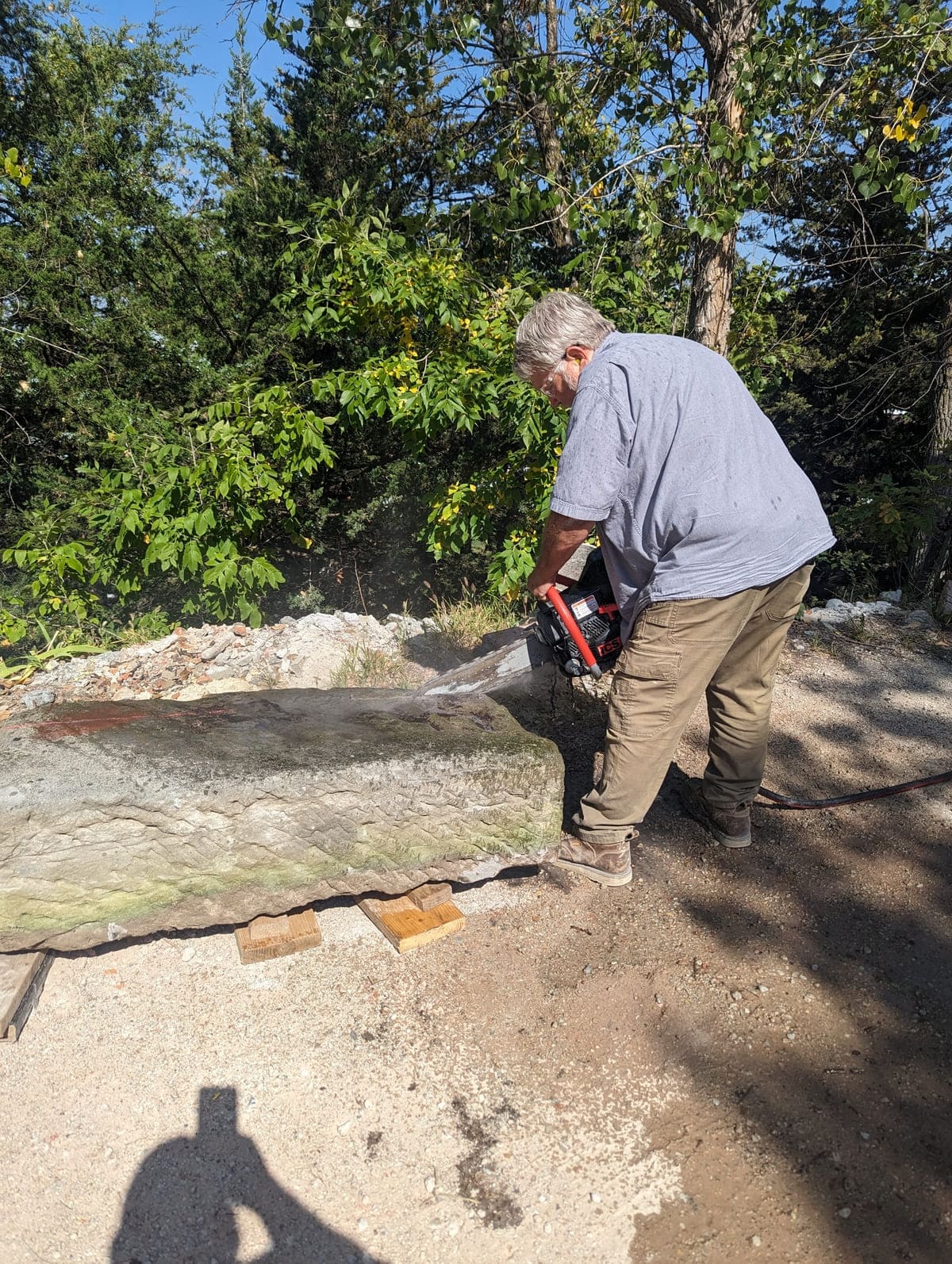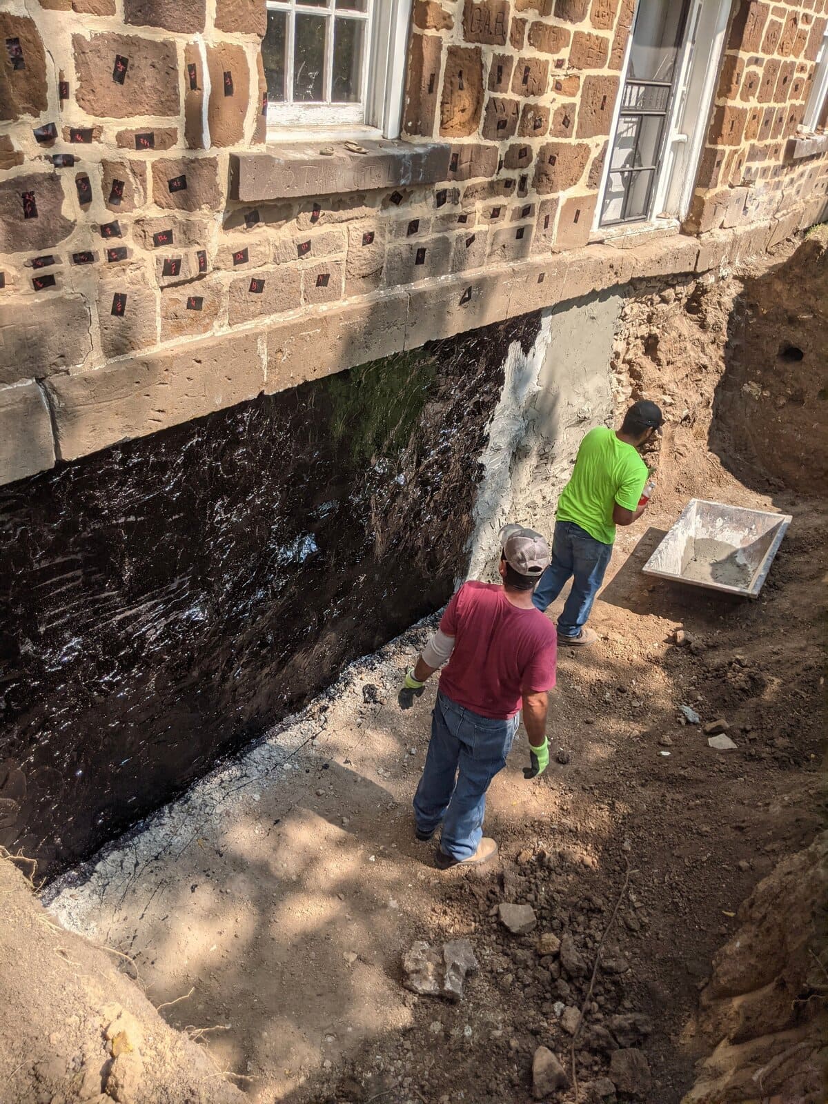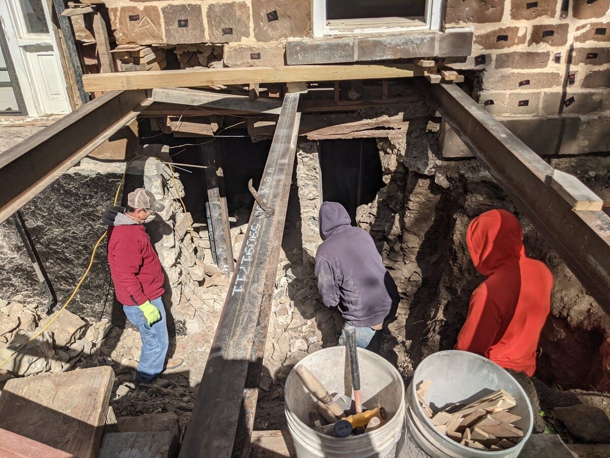 To maintain structural integrity during the rebuild, temporary support systems were installed, including steel I-beams where necessary. Several original stones were carefully removed to allow for proper shoring during the foundation stabilization and were then relayed back into their original locations once structural work was completed.